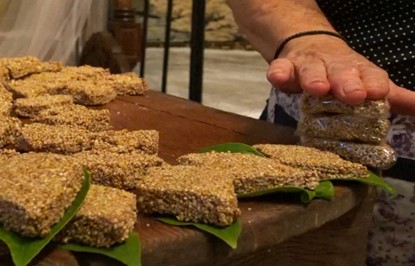Τα παραπάνω υλικά ανακατεύονται με ξύλινη κουτάλα πολύ καλά, ώστε να ομογενοποιηθεί το μείγμα. Το μείγμα απλώνεται σε ξύλινες τάβλες για να κρυώσει και στη συνέχεια κόβεται σε ρόμβους με τη βοήθεια ενός μεγάλου ξύλου (χάρακα). Σερβίρεται πάνω σε φύλλα λεμονιάς ή τυλίγεται σε σελοφάν και σε ειδικό χαρτί (λαδόκολλα).